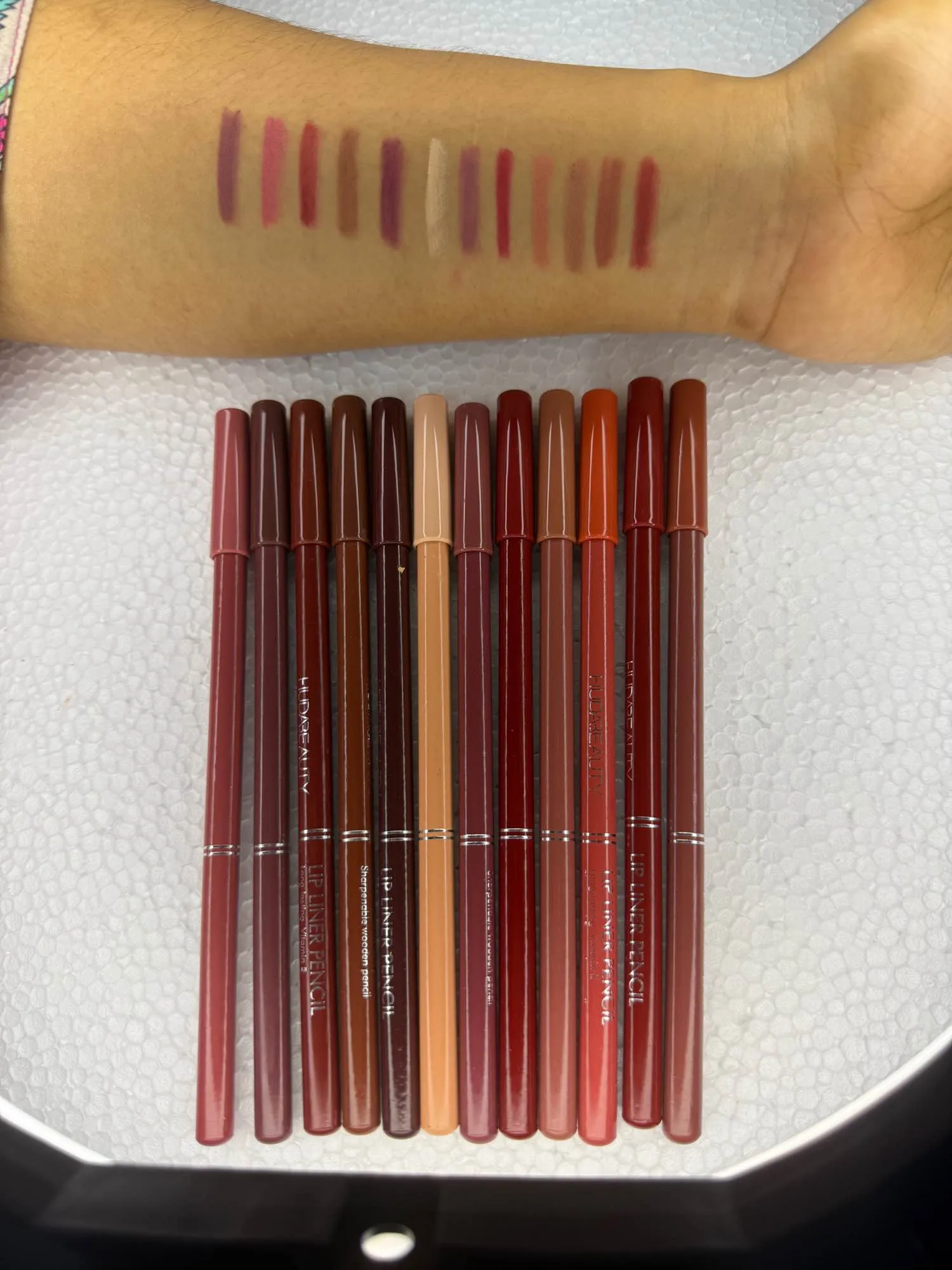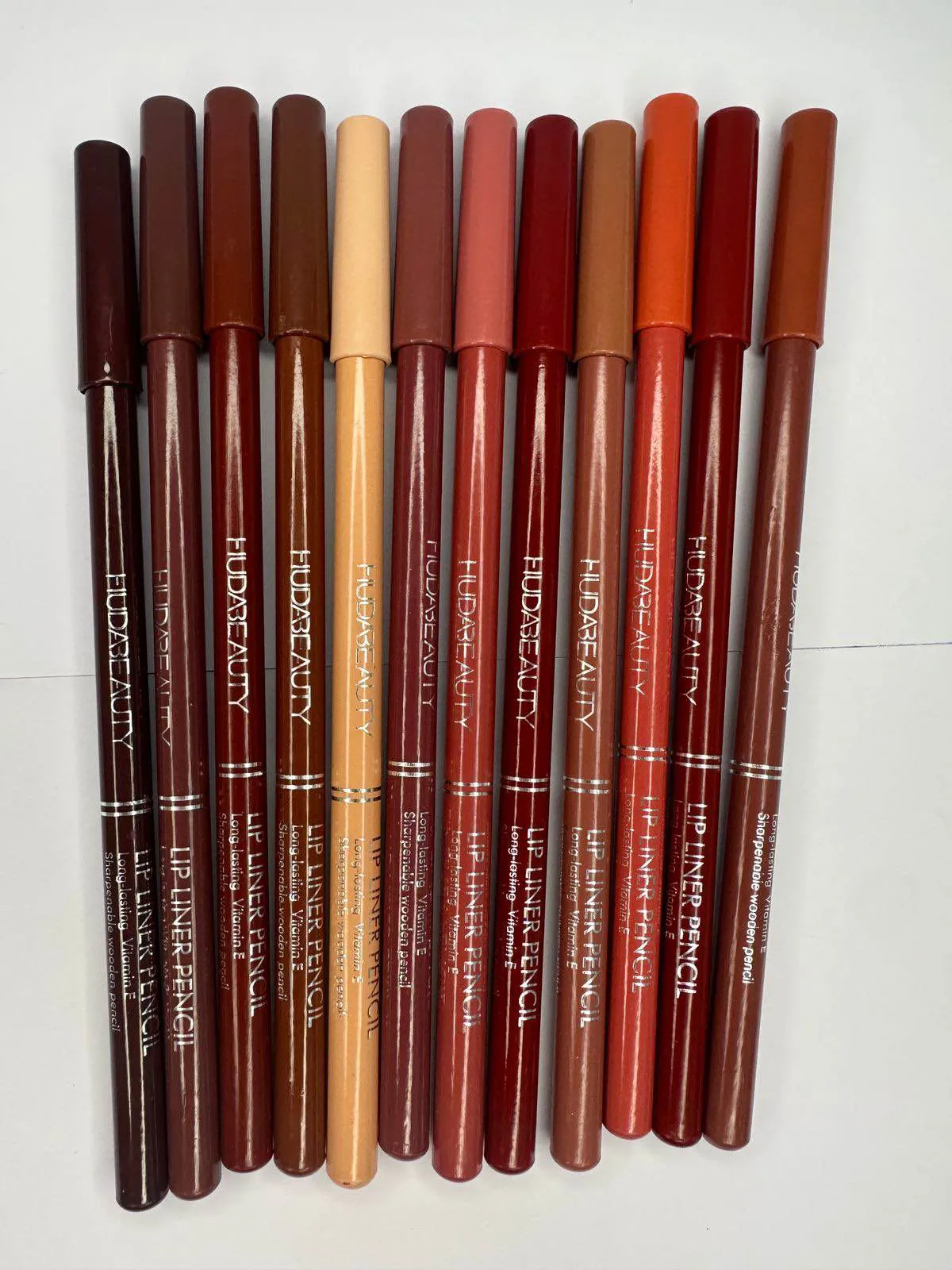 Enhance your lip game with this elegant 12-piece Huda Beauty Lip Liner Set, featuring a range of warm nudes, earthy browns, muted pinks, and bold berry tones. Designed for precision and long wear, these creamy pencils glide smoothly for perfect lip definition or full coverage wear.